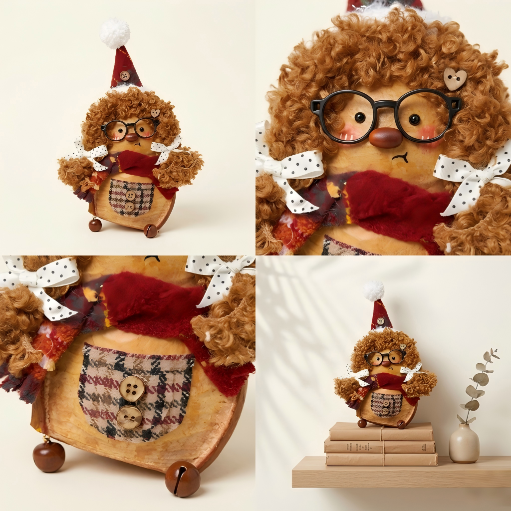 The Artisan’s Touch: Every Aimomo is a labor of patience. Starting with a single, naturally dried pod, we layer reclaimed textiles, hand-spun curly yarn, and curated wooden accents. Notice the fine details: the miniature round-rimmed glasses that give Aimomo its studious charm, and the tiny brass bells that offer a soft, rhythmic chime with every movement.
